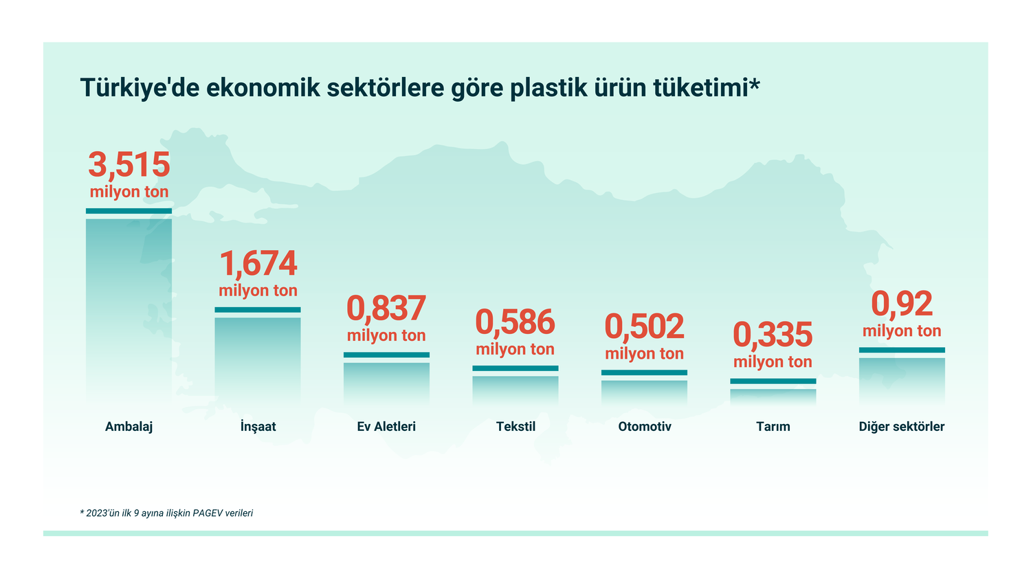 PAGEV'e göre, 2023 yılının ilk dokuz ayında ülke içinde 35,2 milyar dolar değerinde 8,4 milyon ton bitmiş plastik ürün üretildi. Geçen yılın aynı dönemine kıyasla üretim hacim olarak %4,4 ve para olarak %3,9 arttı. PAGEV yıllık üretim rakamlarının 11,2 milyon tona (+%6,3) ve 46,9 milyar dolara (+%6,2) ulaşacağını tahmin ediyor.