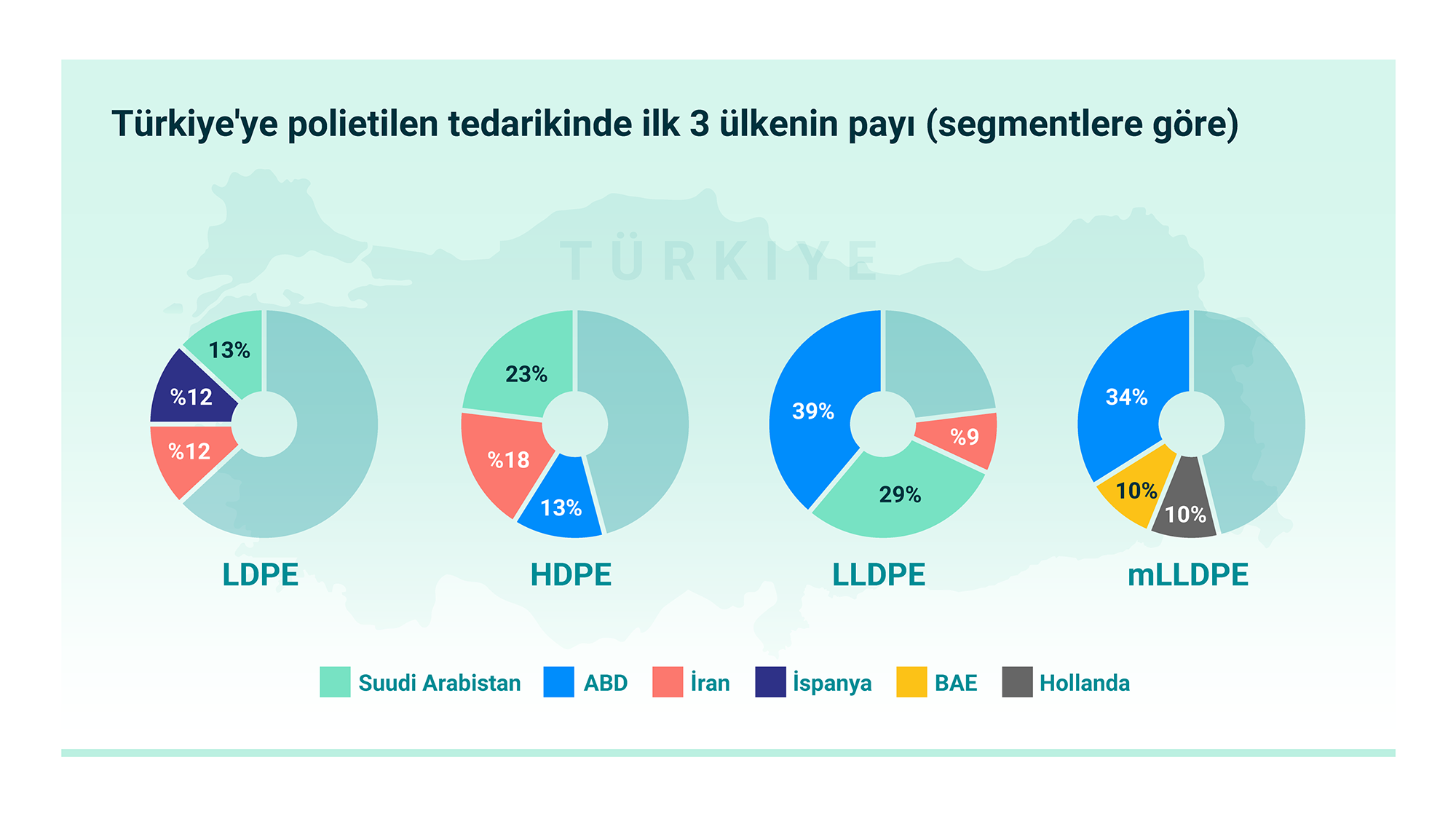 Yılın ilk yarısında Türkiye'ye yapılan lineer alçak yoğunluklu polietilen (LLDPE) ithalatı ise hemen hemen değişmeyerek 362 bin ton olarak gerçekleşti. ABD, Suudi Arabistan'ı geçerek ana tedarikçi haline gelerek 142 bin ton LLDPE'yi Türkiye'ye getirerek payını %27'den %39'a çıkardı. Suudi Arabistan'ın 104 bin tonluk payı var ve geçen yılki %34'e kıyasla %29'luk bir paya sahiptir. İran 25 bin tonla üçüncü sırada kaldı ancak toplam teradik payı %9'dan %7'ye düştü.