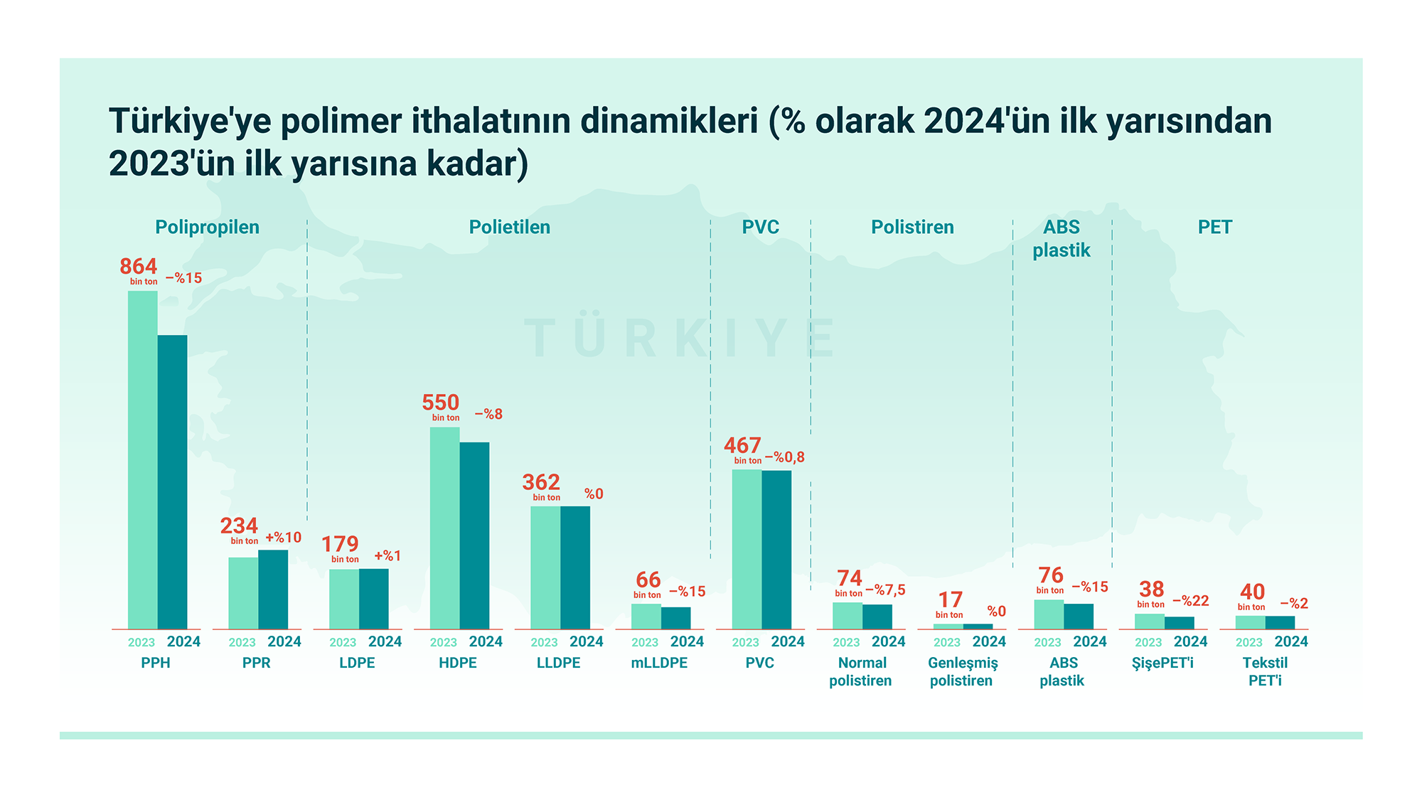 2024 yılının ilk yarısında Türkiye, 864 bin ton homopolipropilen (PPH) ithalatı gerçekleştirdi; bu rakam, 2023 yılının aynı dönemine göre yaklaşık %15 oranında bir düşüş göstermektedir.