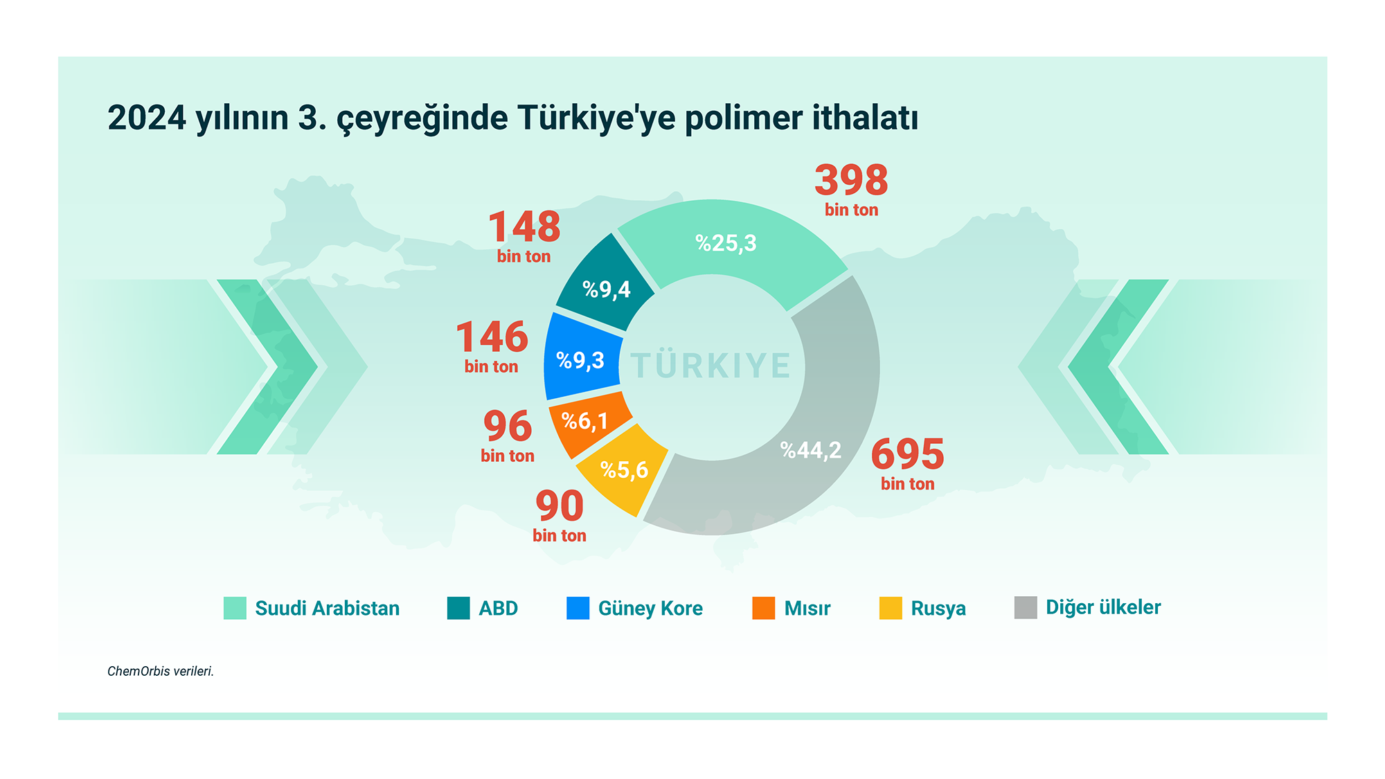 ChemOrbis verileri, 3. çeyrekte Türkiye'ye yapılan toplam polimer ithalatının bir önceki çeyreğe göre neredeyse %1,5 artarak 1,573 milyon tona ulaştığını gösterdi; bu da dış alımlardaki büyümenin 2024 sonuna kadar devam edeceğine dair umut veriyor. Ancak ithalatın 1,7 milyon tonu aştığı 2023 yılının 3. çeyreğine göre hacim %9,5 oranında azaldı. Toplamda yaklaşık %56 paya sahip ilk beş tedarikçi arasında Suudi Arabistan, ABD, Güney Kore, Mısır ve Rusya yer alıyor.